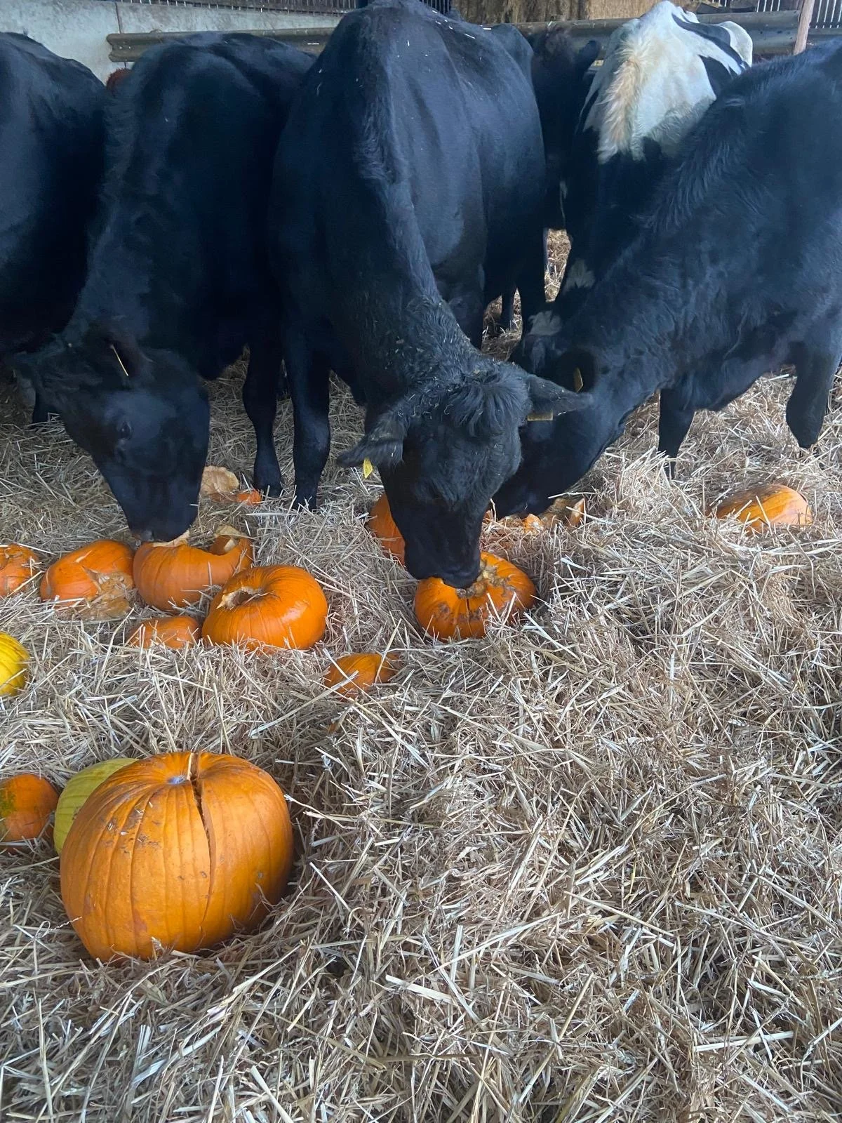 The cows are back home again for the winter and are enjoying some leftover pumpkins.